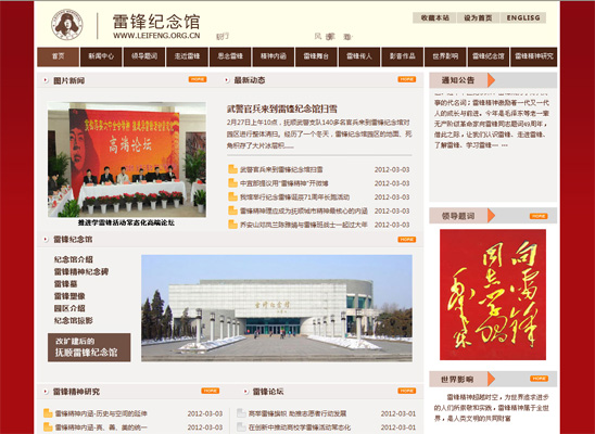 撫順市雷鋒紀(jì)念館網(wǎng)站由英特企業(yè)在線與撫順市雷鋒紀(jì)念館雙方合作建立,目前已經(jīng)平穩(wěn)運(yùn)行十年,為宣傳撫順城市文明和雷鋒精神起了一定作用,感謝您的關(guān)注,并請繼續(xù)支持我們。
